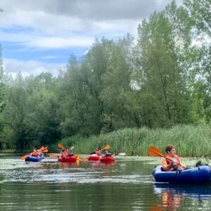 Onze lunchpauze houden we in een gezellig caféetje aan het water. Daarna stap je in je packraft voor een kalme peddeltocht van vijf kilometer terug. Het water leidt je tussen waterlelies, zingende fuutjes en nieuwsgierige reigers. De wereld lijkt even stil te staan — behalve jij, in zachte beweging.